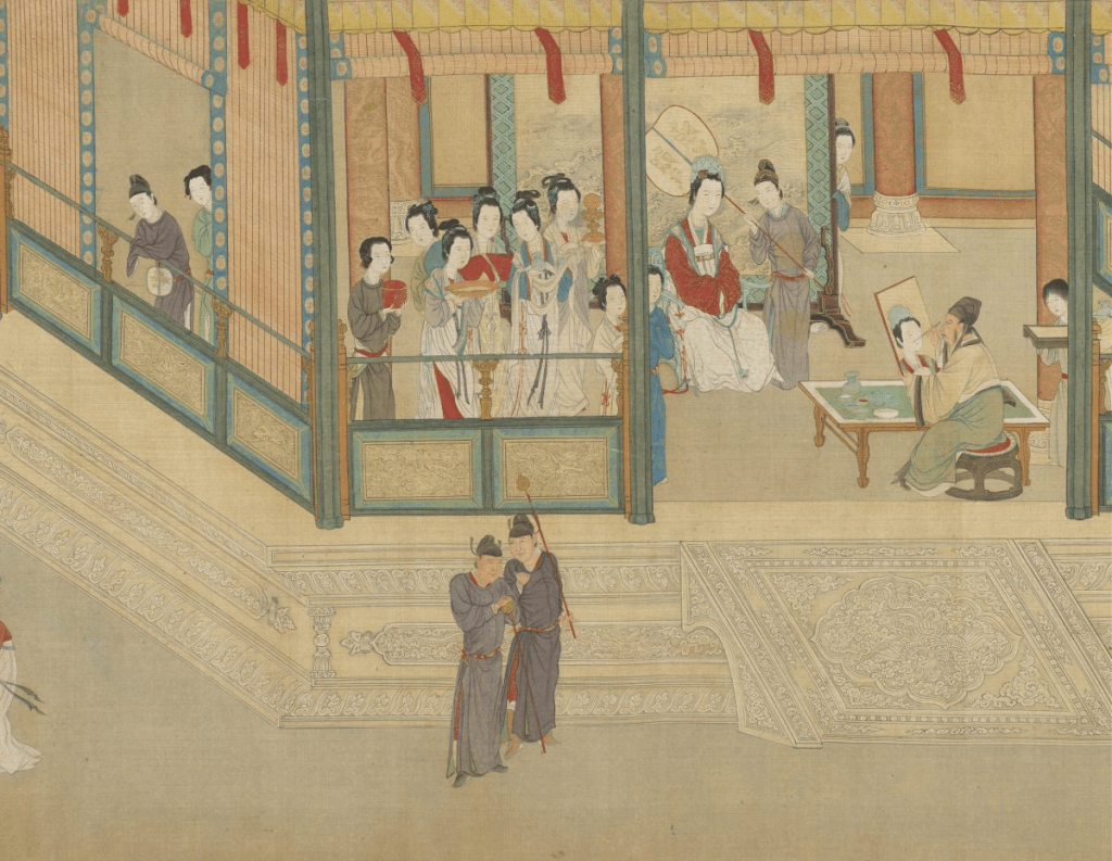 This painting was made by an artist named Qiu Ying and it was a part of a series of paintings he made in a long handscroll depicting court ladies in the Han Dynasty palace (206 B.C.–A.D. 220) called “Spring Morning in the Han Palace.” In this painting Qiu Ying wanted to illustrate the competitiveness of court life. Before an emperor chose a consort (meaning spouse or wife) it was tradition for him to be presented portraits of the ladies before meeting them. Court ladies often would bribe the illustrator to portray them as more beautiful than they actually are so that they emperor would choose them. However, the lady who’s having her portrait being made didn’t want to bribe the artist but insisted on making her look beautiful anyways. The artist then decides the manipulate the portrait drawing flaws to her face such as moles. Other people in the image includes servants and other court ladies waiting for their turn gossiping amongst each other. We can see a court lady peeking behind the screen probably wondering if the lady being painted might look more beautiful and two guards on the ground level laughing at the scene happening (2 Ancient Chinese Paintings on Humility and Integrity).